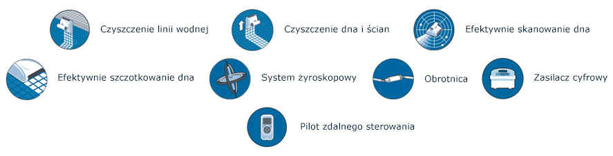 - Zaawansowane oprogramowanie odkurzacza zapewnia doskonałą skuteczność czyszczenia i odkurzania dna, ścian i linii wodnej basenu praktycznie nie pozostawiając miejsc wymagających dodatkowego czyszczenia.